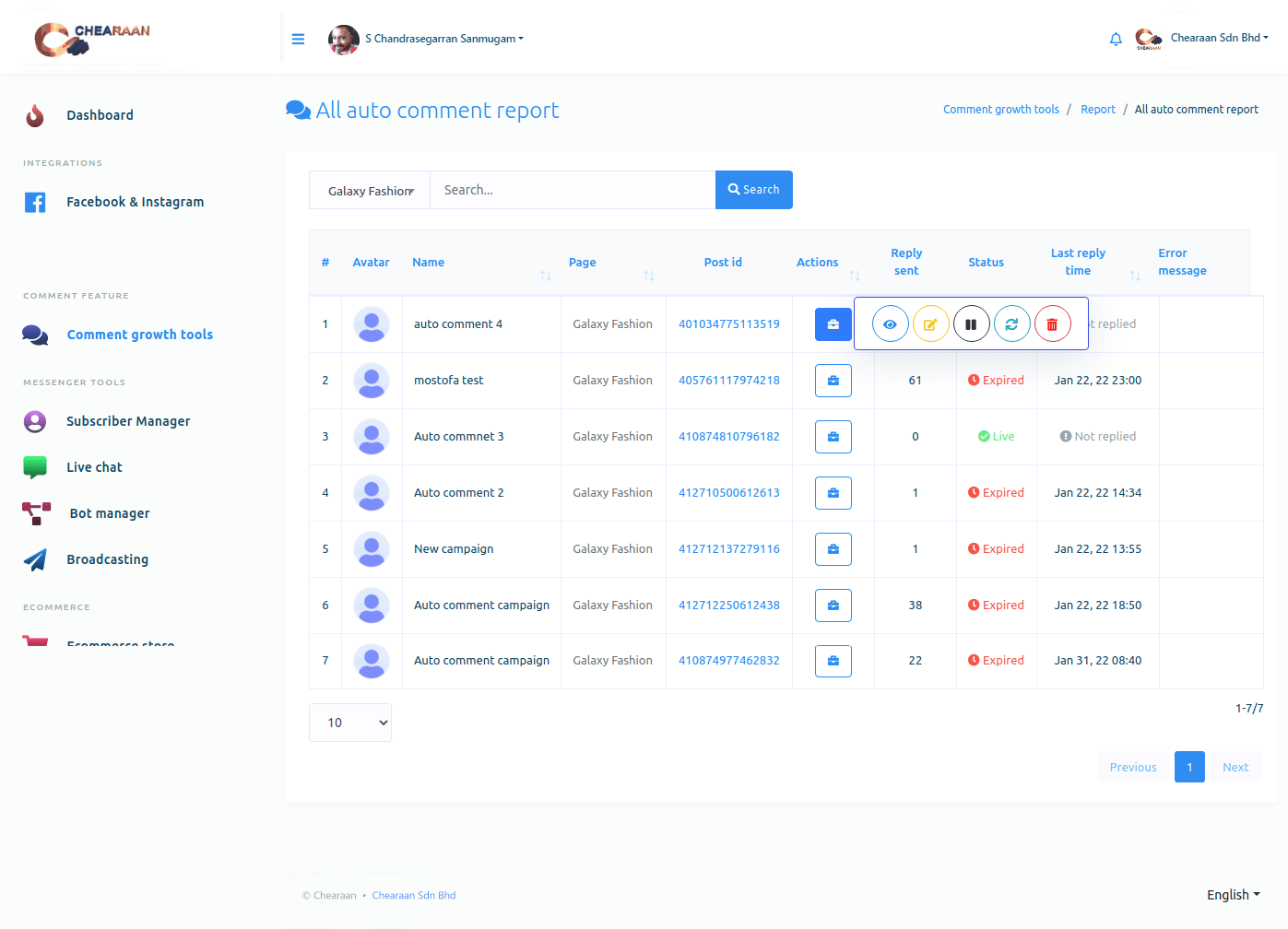 Instantly, a page called All auto comment report will appear. Now click on the Action button of an Auto comment campaign and a pop-up menu of different buttons — eye icon button, edit button, pause button, force processing button and delete button — will appear.