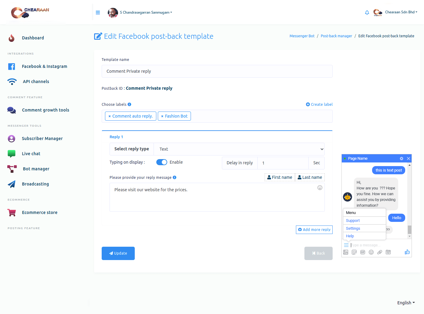 Just as you click on the view/edit button, a page called edit Facebook post-back template will appear. And on the page, you can edit the postback template easily.