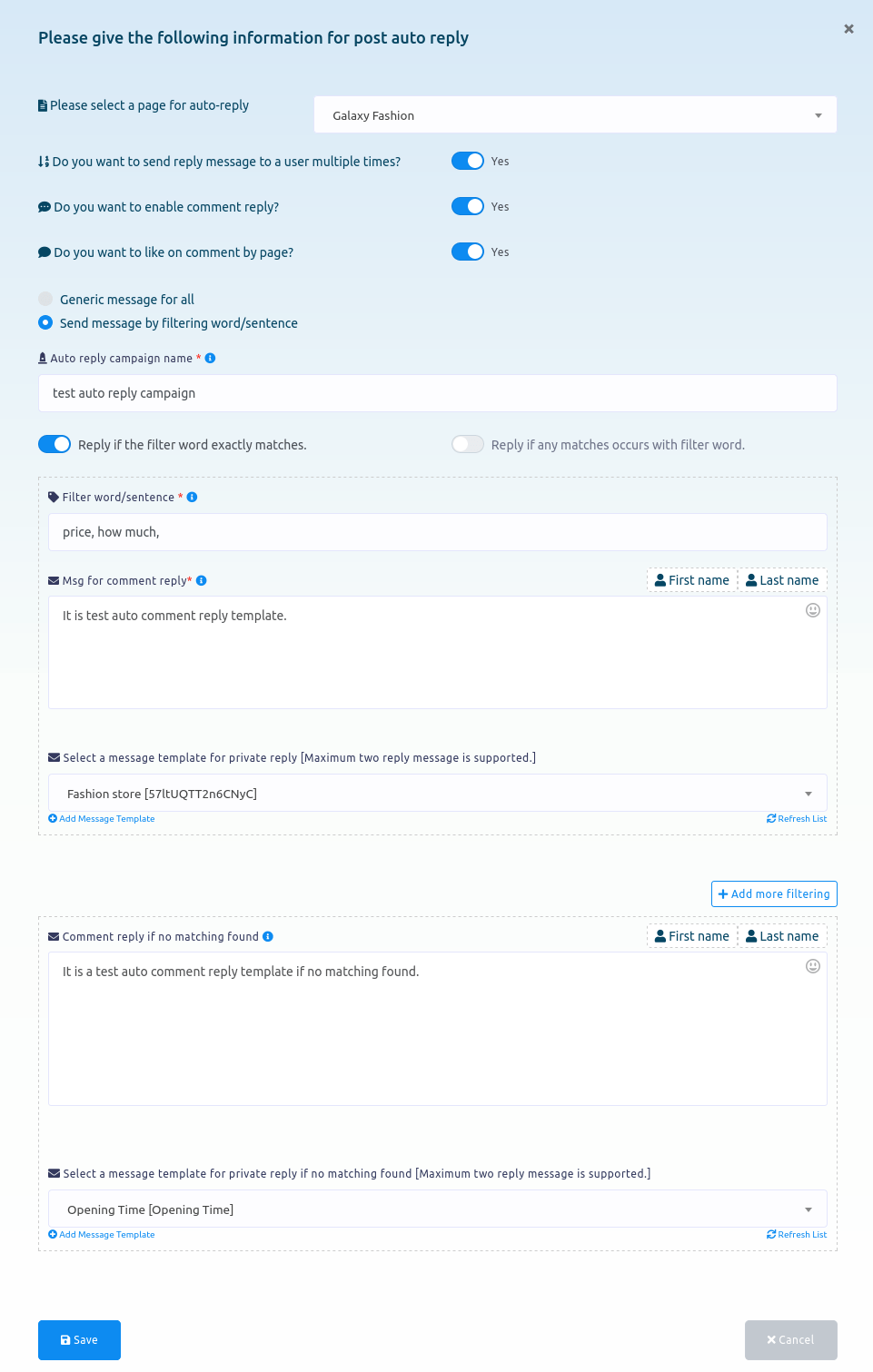Then you have to enable one option from two options — Reply if the filter word exactly matches and Reply if any matches occurs with filter word.
