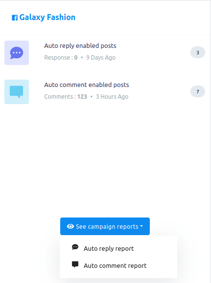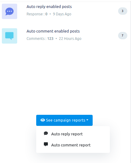 If you want to see campaign reports in detail, click on the see campaign reports button. Instantly, a drop-down menu of two options — auto reply report and auto comment report will appear.