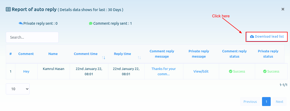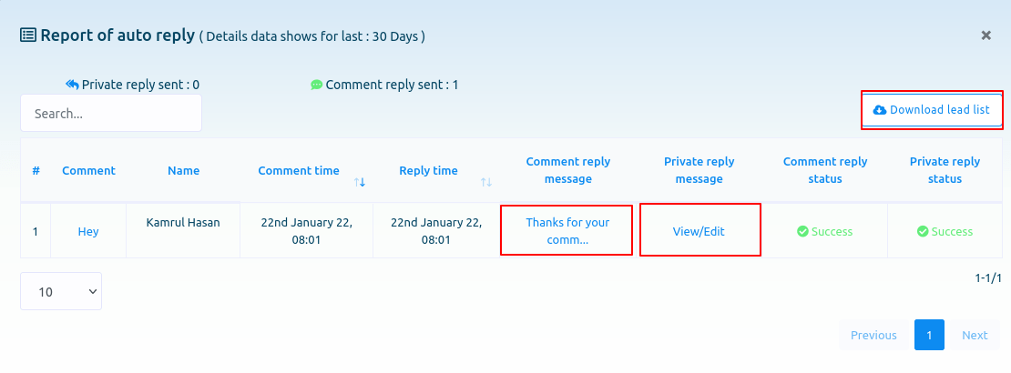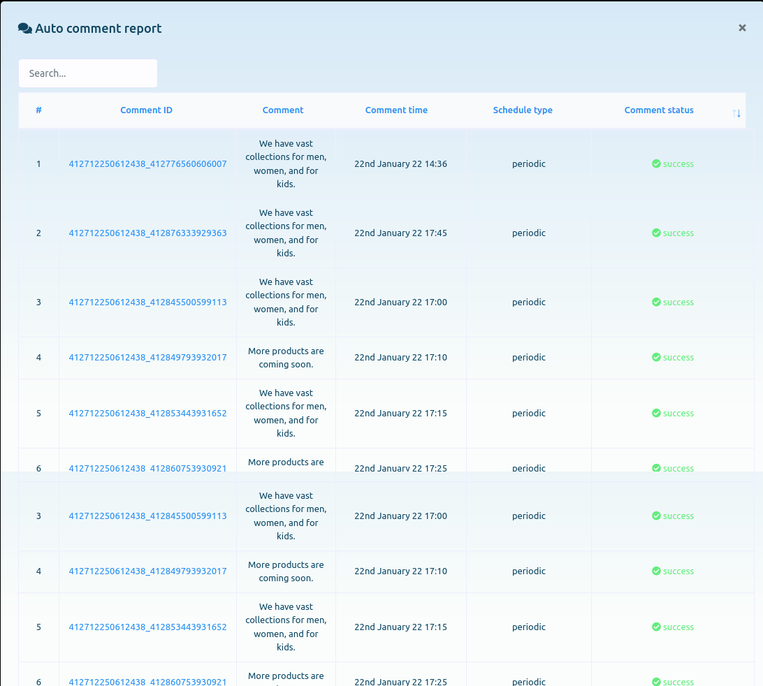 Now click on the eye icon button and instantly, a modal form called Auto comment report will appear. And on the page, you can see the report of the auto comment report.