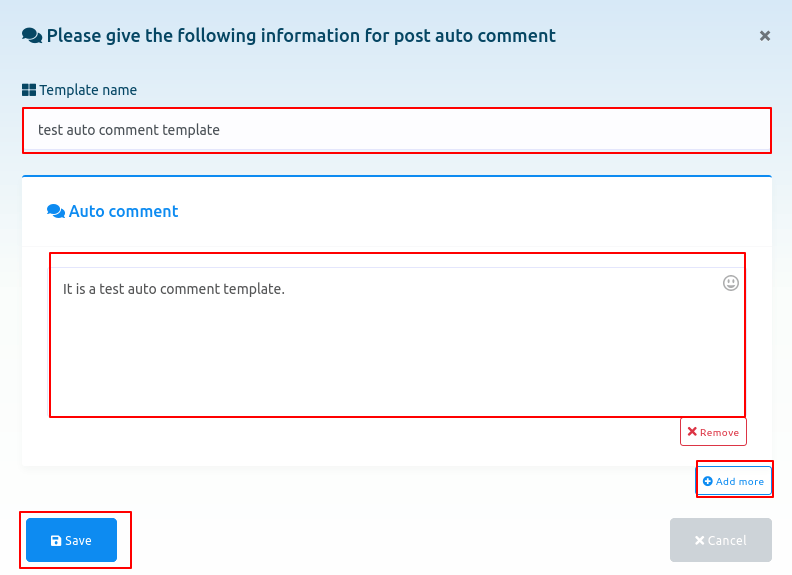 Write a ‘Template name’ in the ‘Template name’ box. Then write a comment in the ‘Auto comment’ box, the comment that will be made automatically under your Facebook pages’ posts. You can add as many comments as you want by clicking on the ‘Add more’ button. Then click on the ‘Save’ button.
