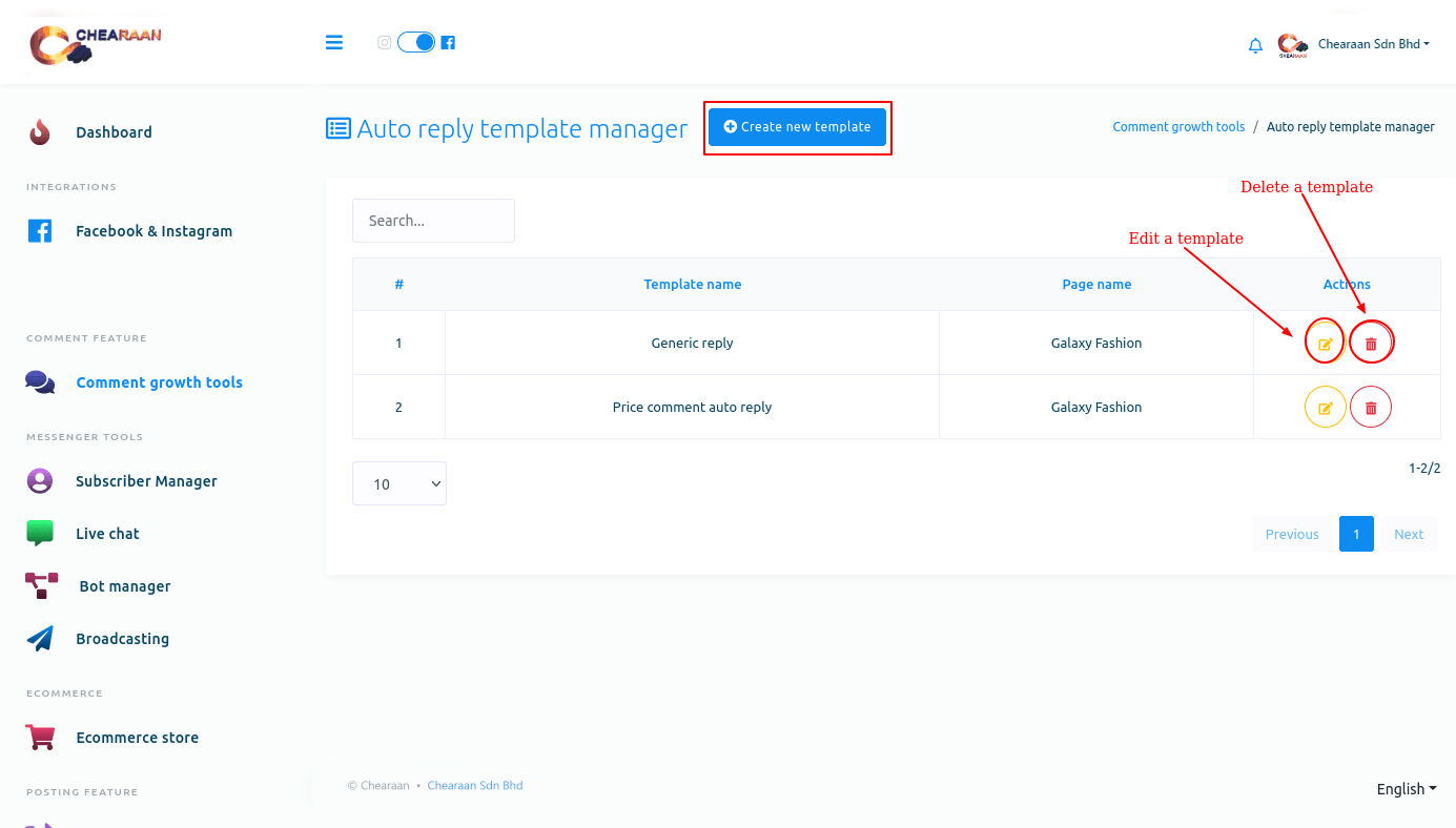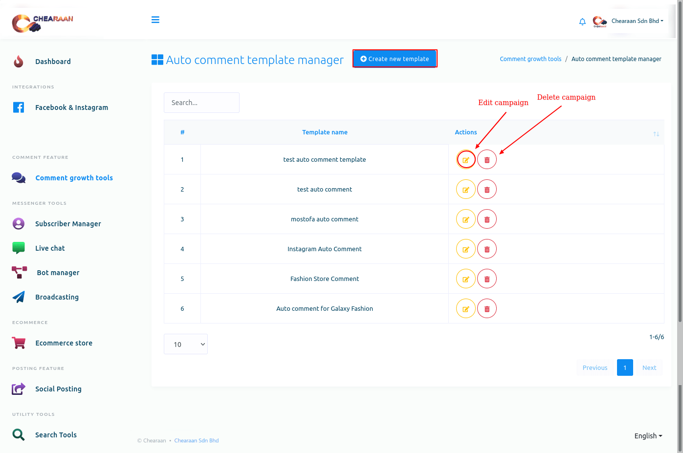 Now the template is created, and you can see the template name on the page called ‘Auto comment template manager’. Next to the template name, you will see the ‘edit’ and ‘delete’ icons. By clicking on the ‘Edit’ icon, you can edit the campaign. And by clicking on the ‘Delete’ icon, you can delete the template. Of course, you can create another template by clicking on the ‘Create new template’ button— you can create as many templates as you want.