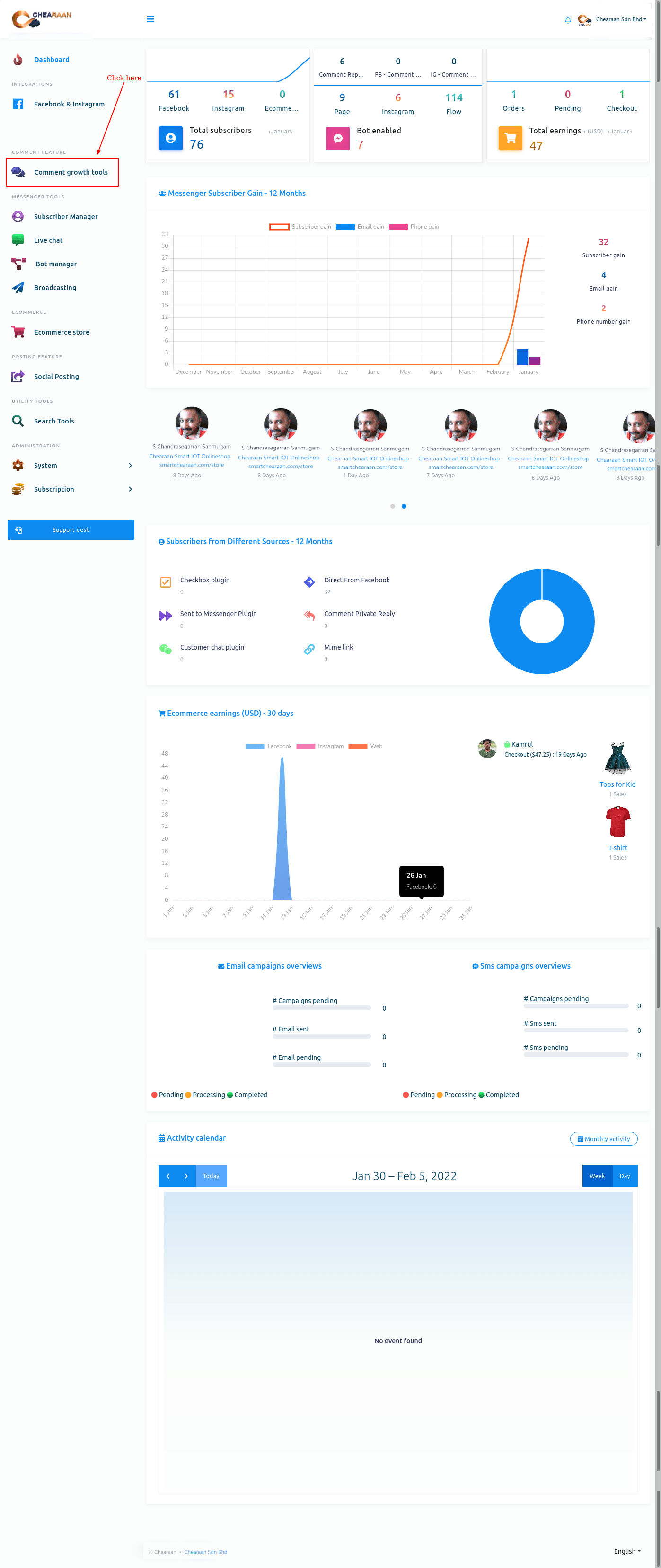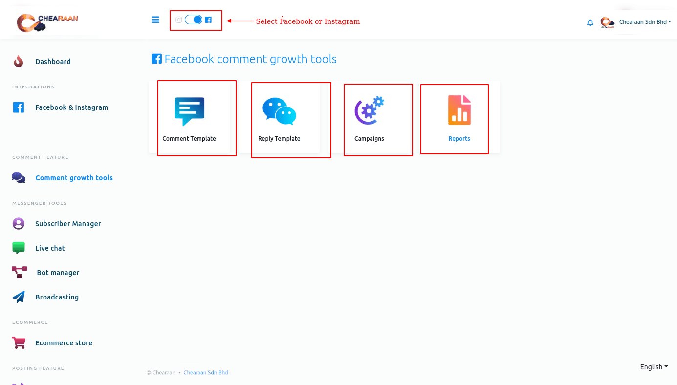 First, go to the dashboard of Chearaan. At the left panel of the dashboard, you will see a menu called comment growth tools. Click on the menu.