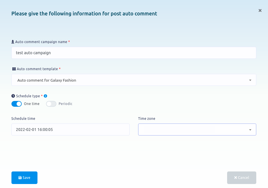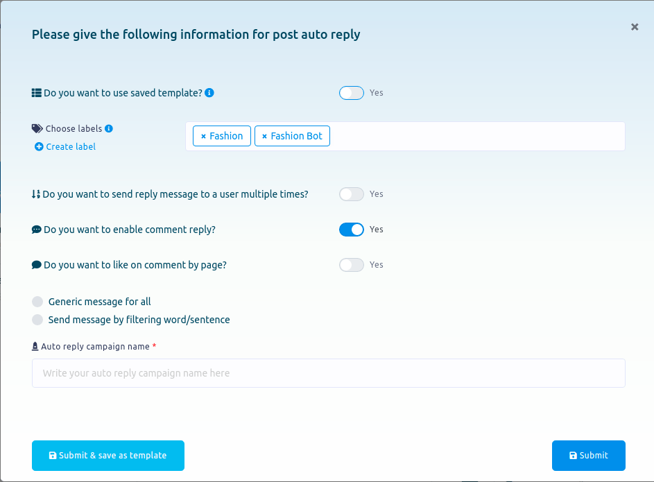 Instantly, a modal form will appear— you have to fill out the form to create an auto comment template.