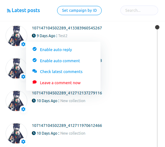 Now click on the gear icon of any post and a drop-down menu of different options — Enable auto reply, Enable auto comment, Check latest comments, Leave a comment now.