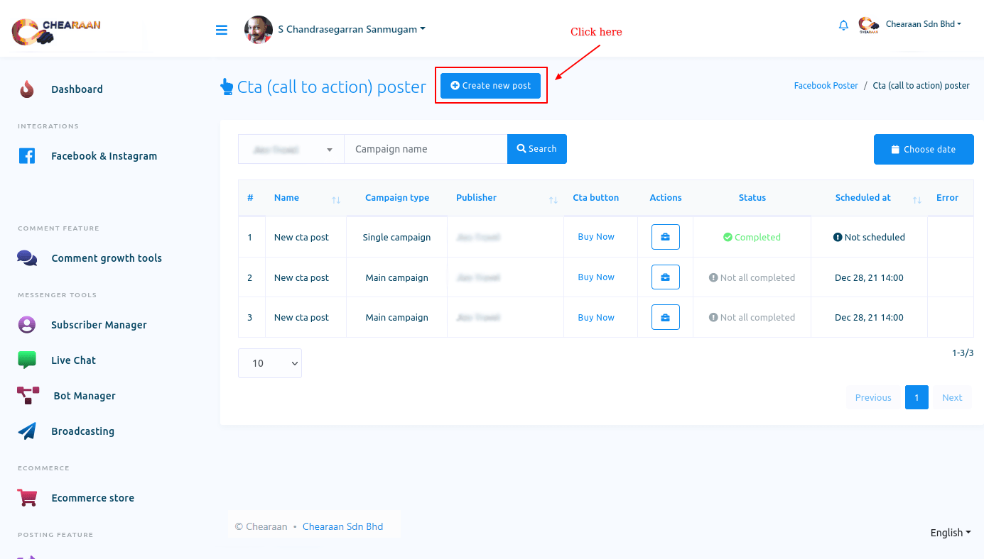 Let’s see how to create a campaign for Call To Action post. Now click on the Cta post and a page called Cta poster will appear with a button called Create new post.