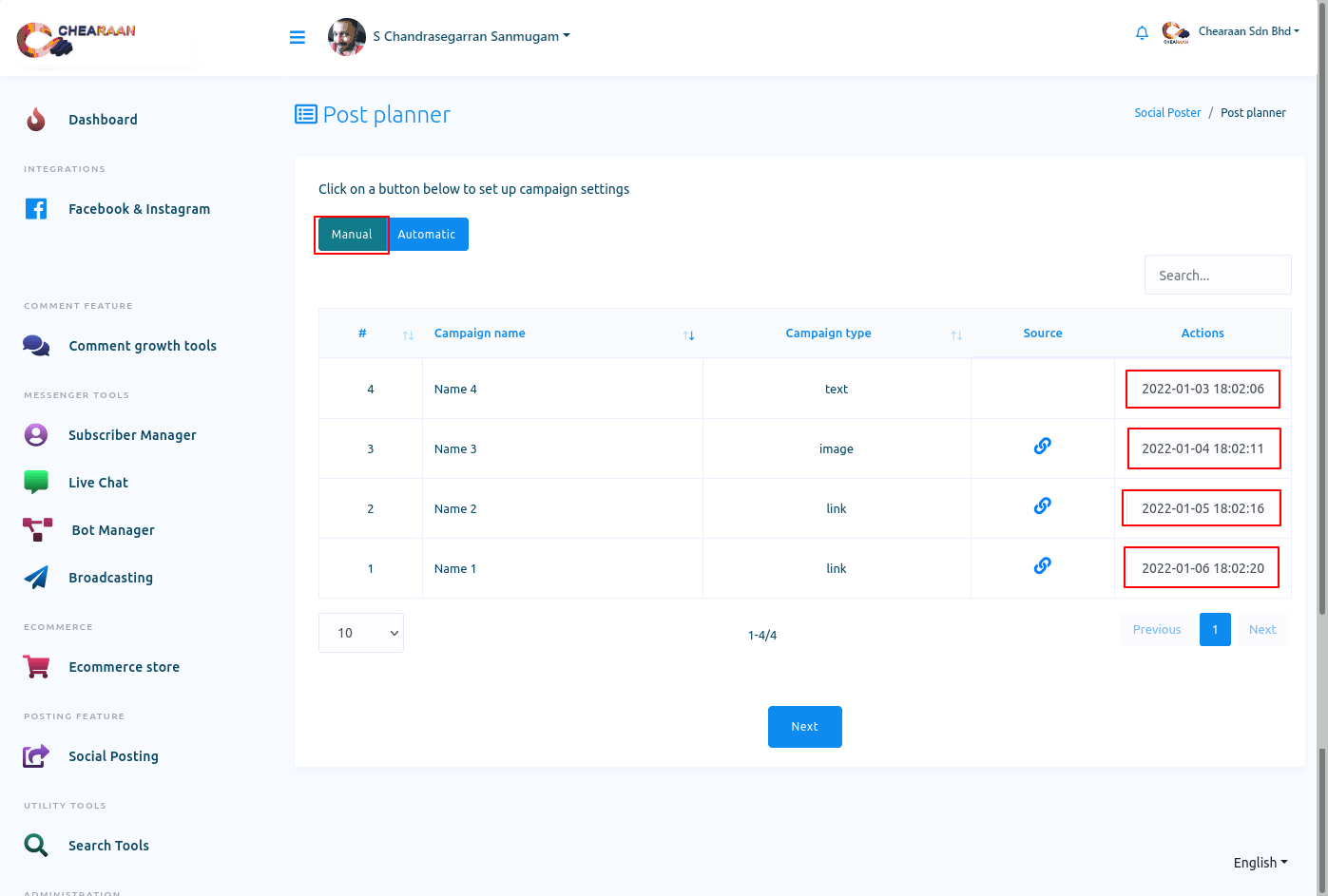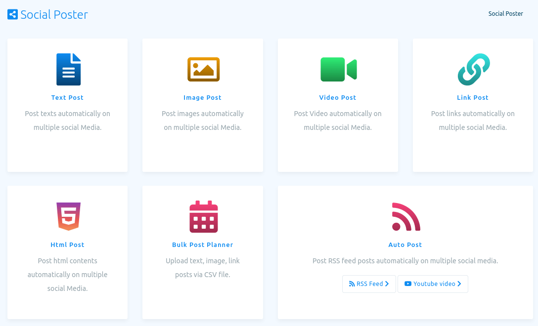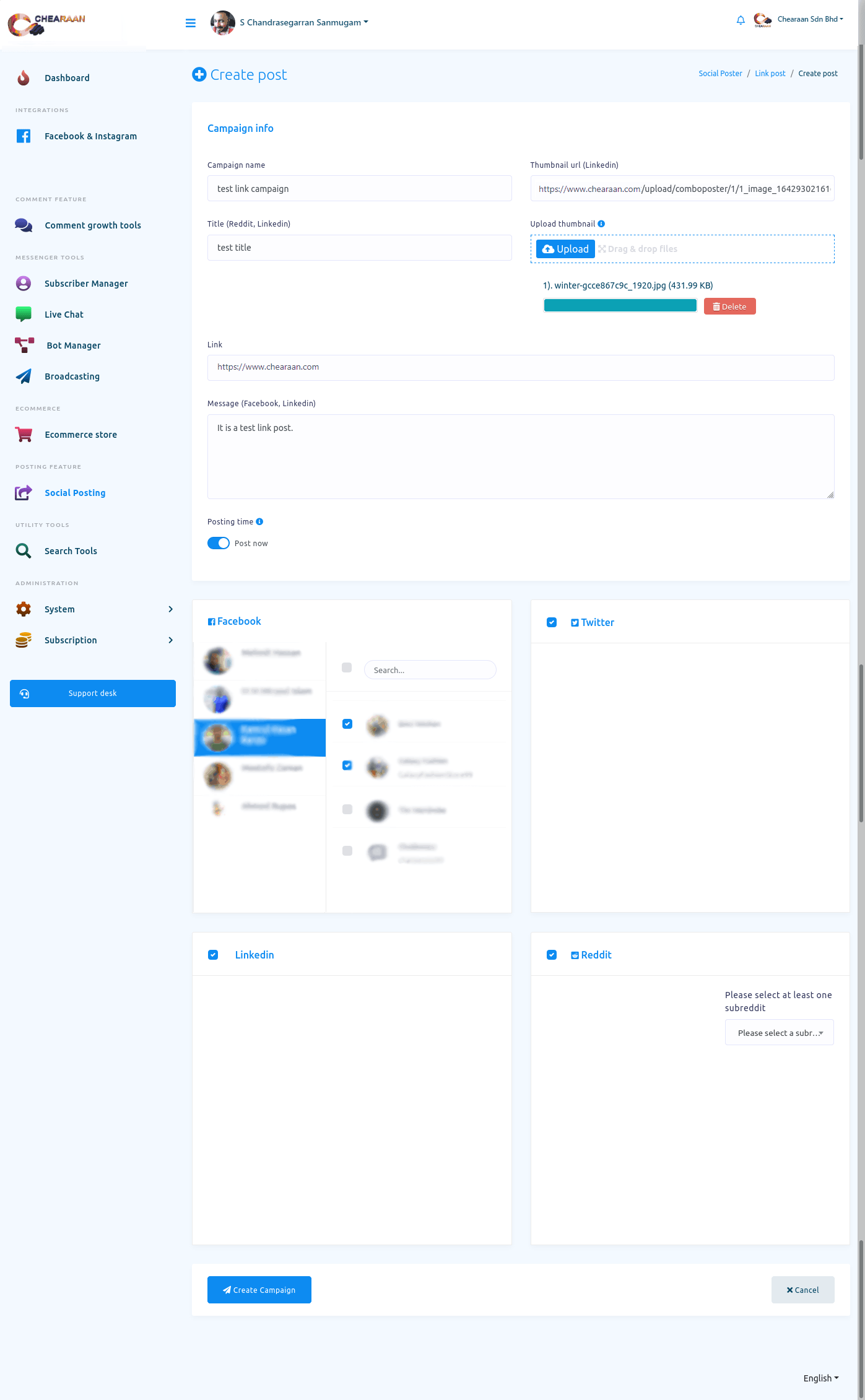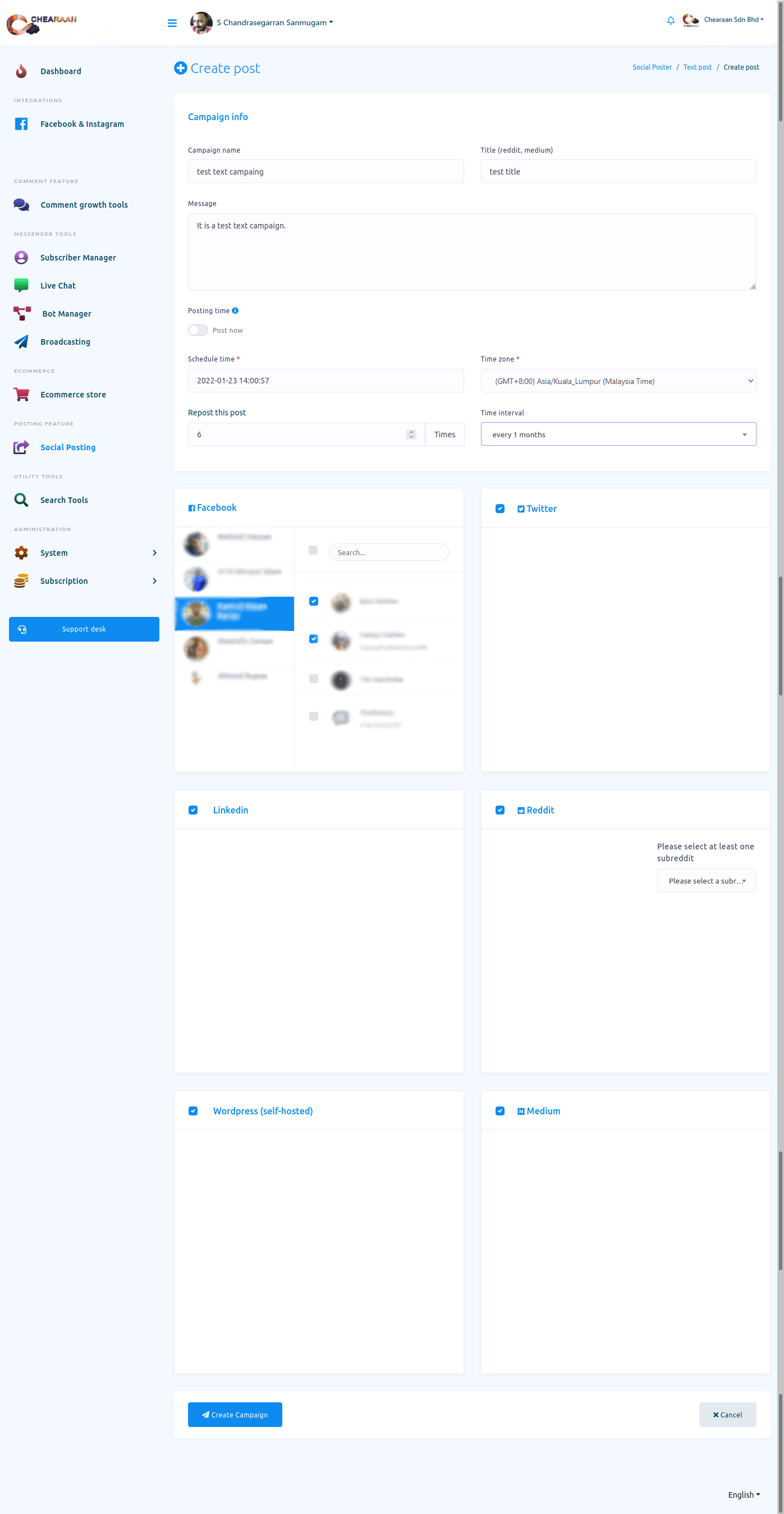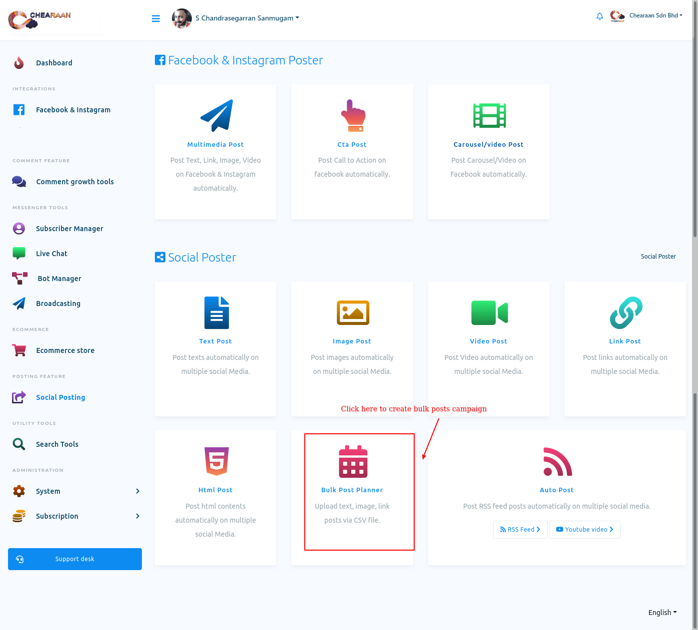 Social Posting feature is an important feature of Chearaan. With the feature, you can schedule and publish posts on Facebook, Instagram and other social media such as Twitter, Linkedin, Reddit, Wordpress(self-hosted), and Medium. You can schedule and publish multimedia post— text post, image post, video post — CTA post, Carousel/Video post, Link post, Html post, Auto post — Rss Feed and Youtube video post. The Social Posting feature also has Bulk post planner. And with the Bulk post planner, you can create multiple posting campaigns by uploading a single CSV file.