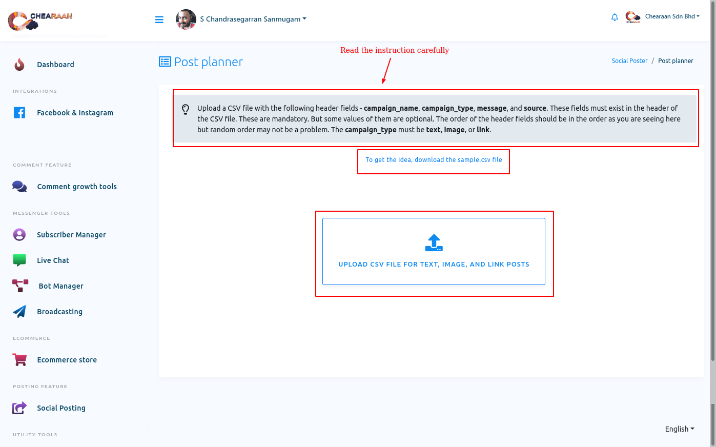 And instantly, a page called post planner will appear. At the beginning of the page, you will see the instruction on how to create a lot of campaigns on different social media by uploading a single CSV file.