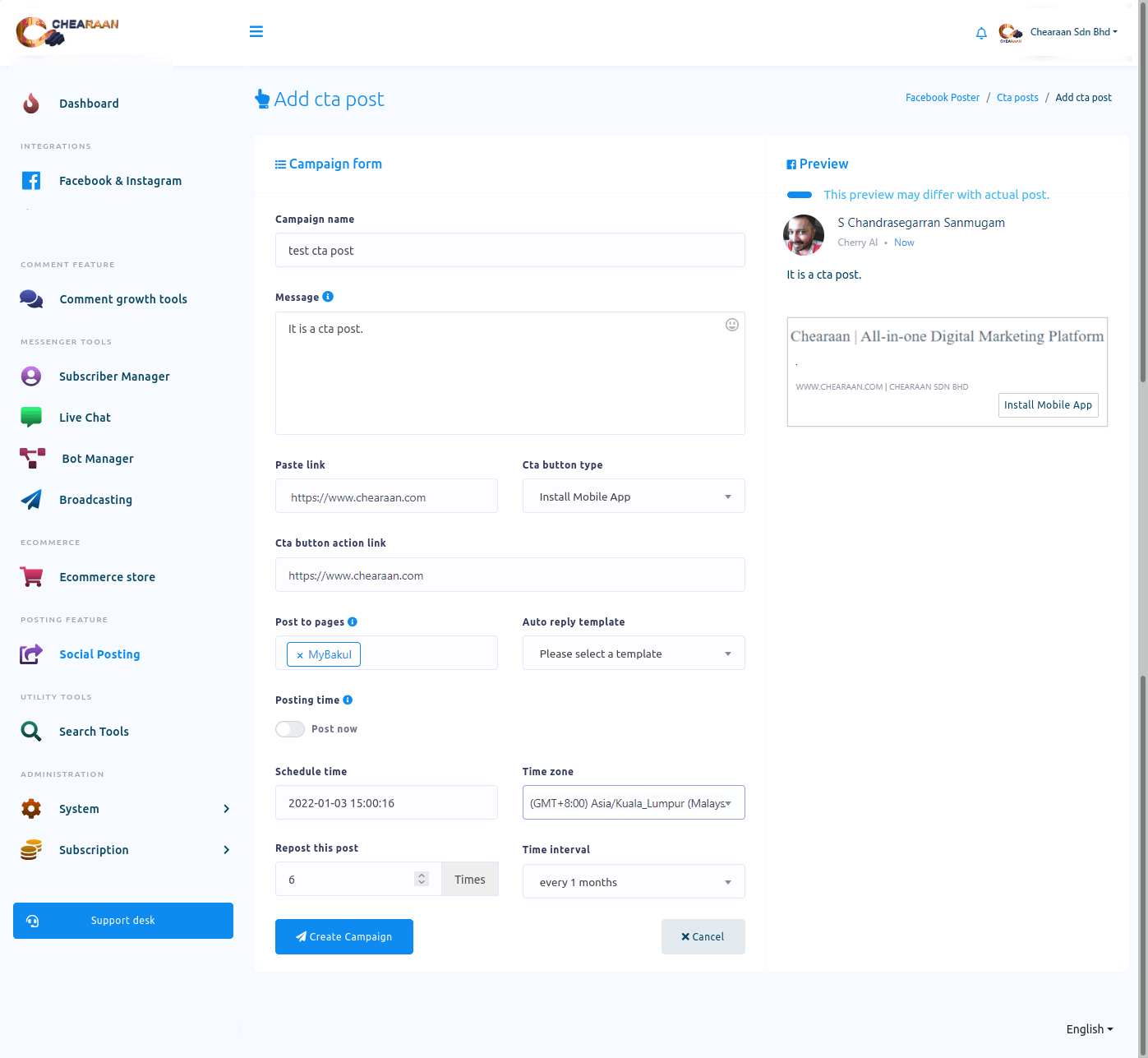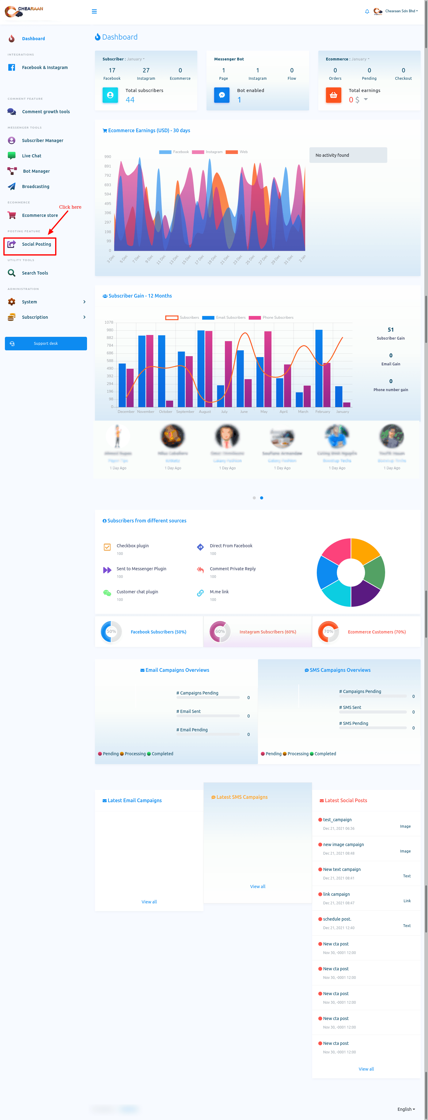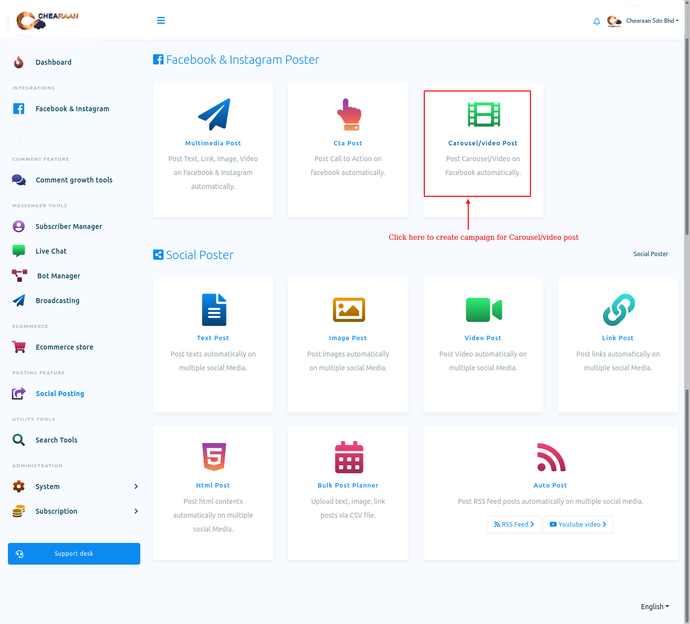 To create Facebook, Instagram, and other social media posting campaign, First, go to the Dashboard of the Chearaan. At the left-sidebar of the Dashboard, you will a menu called Social Posting.