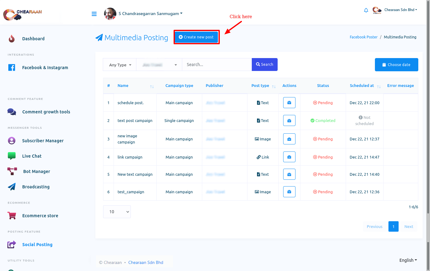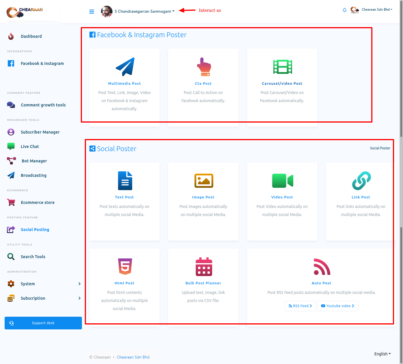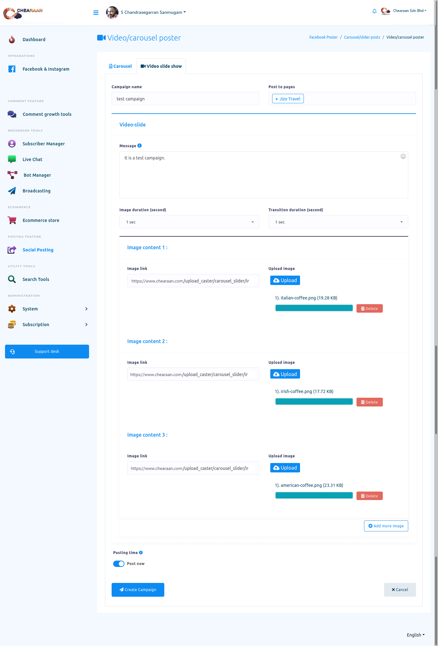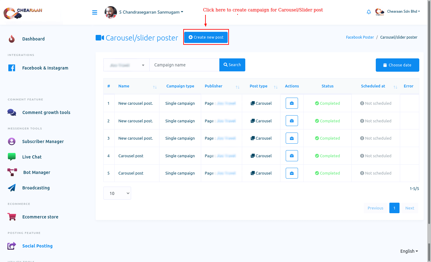 To create Facebook, Instagram, and other social media posting campaign, First, go to the Dashboard of the Chearaan. At the left-sidebar of the Dashboard, you will a menu called Social Posting.