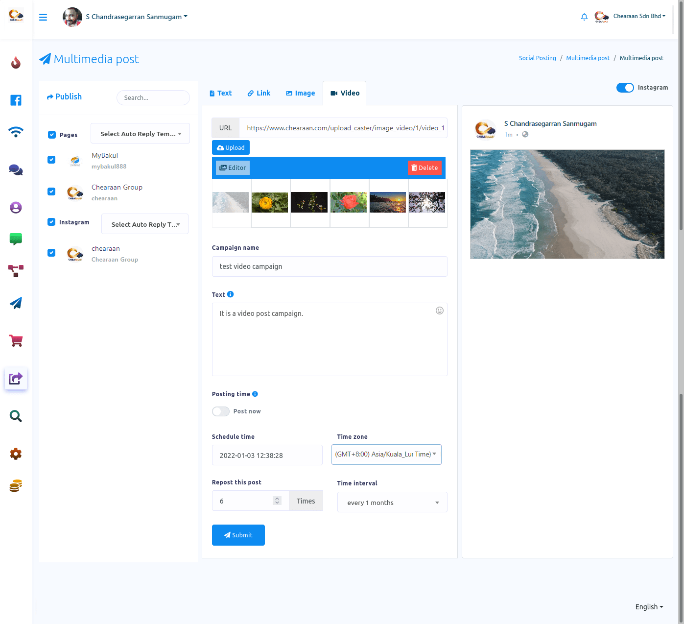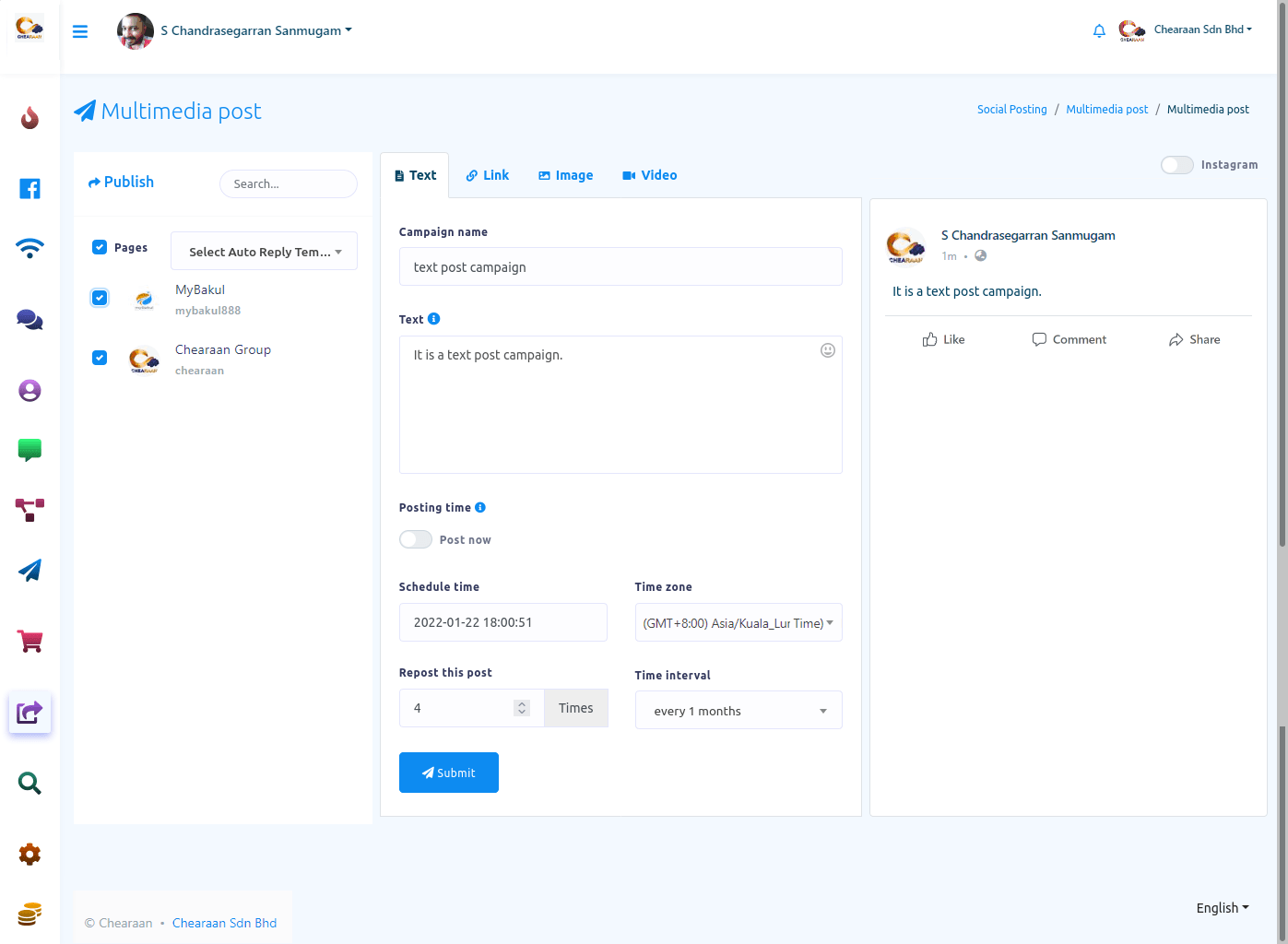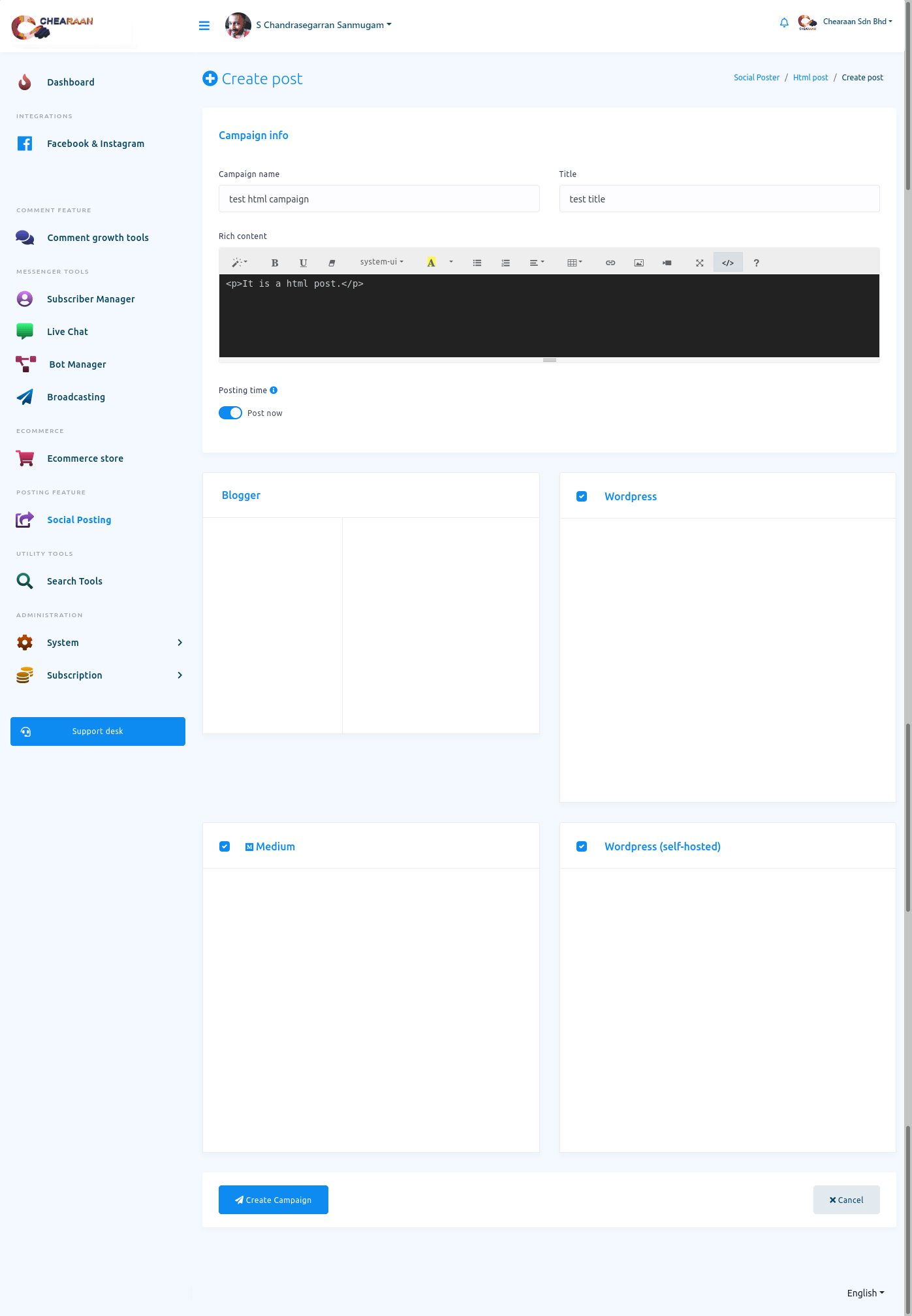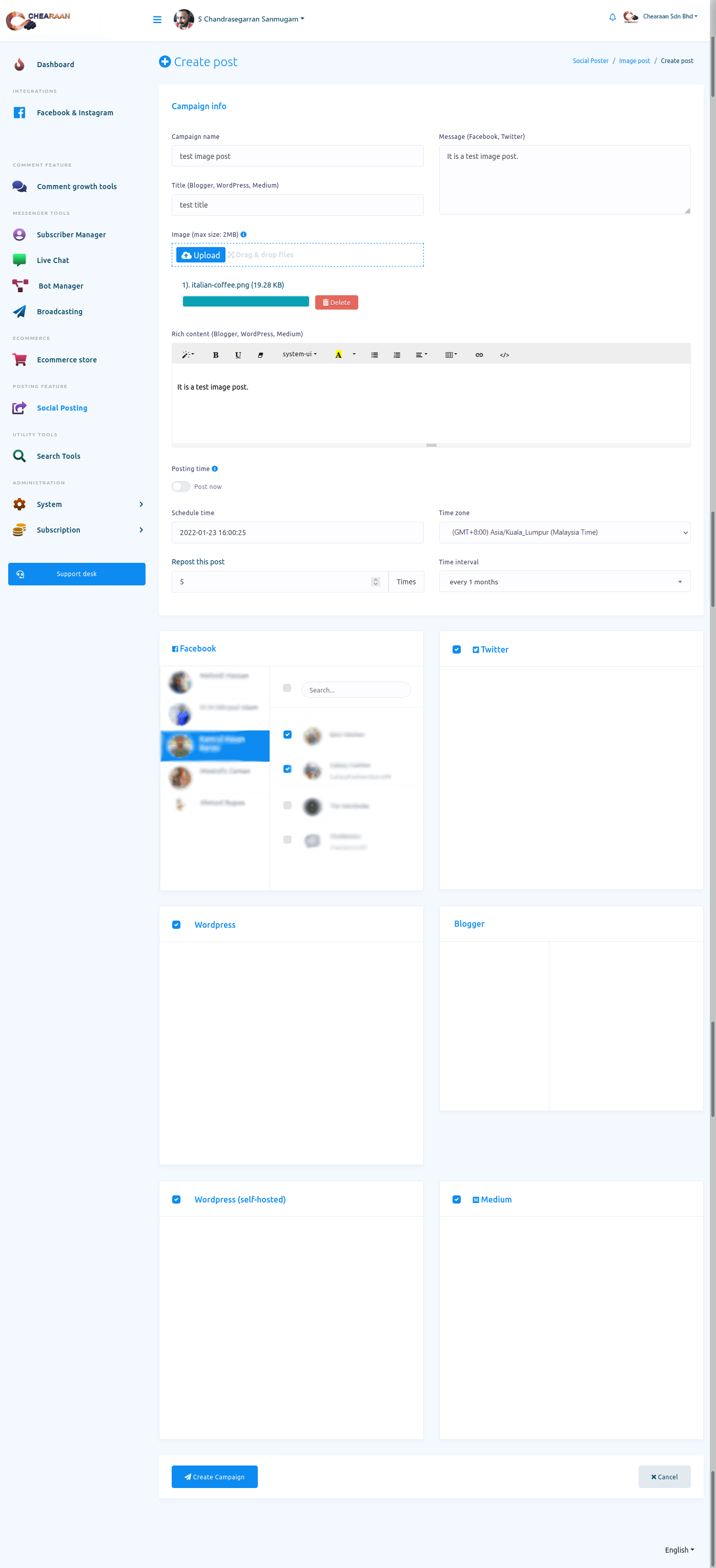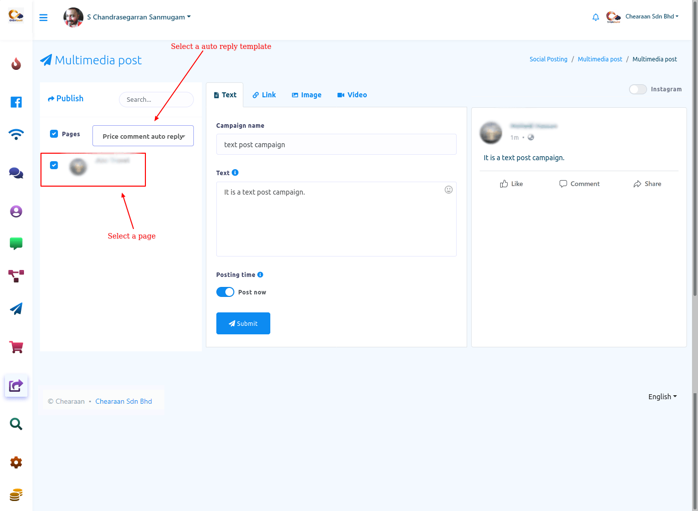 In this article, I will show you how to publish and schedule posts on Facebook, Instagram and other social media with Social posting feature of Chearaan.