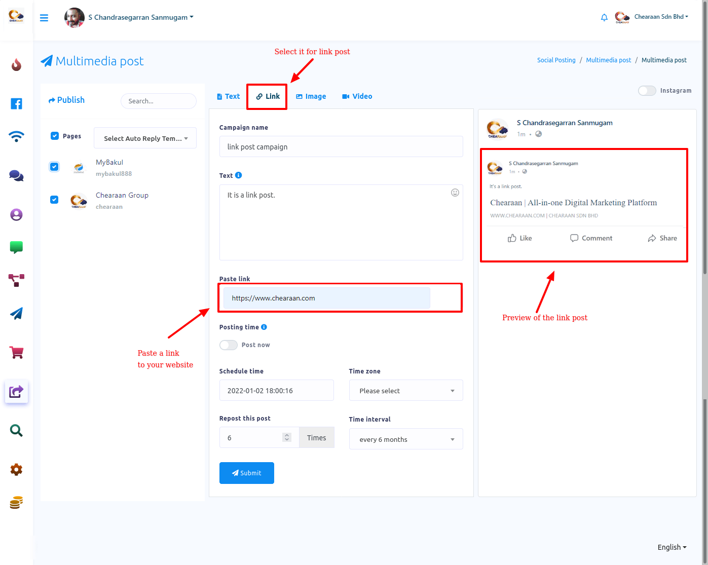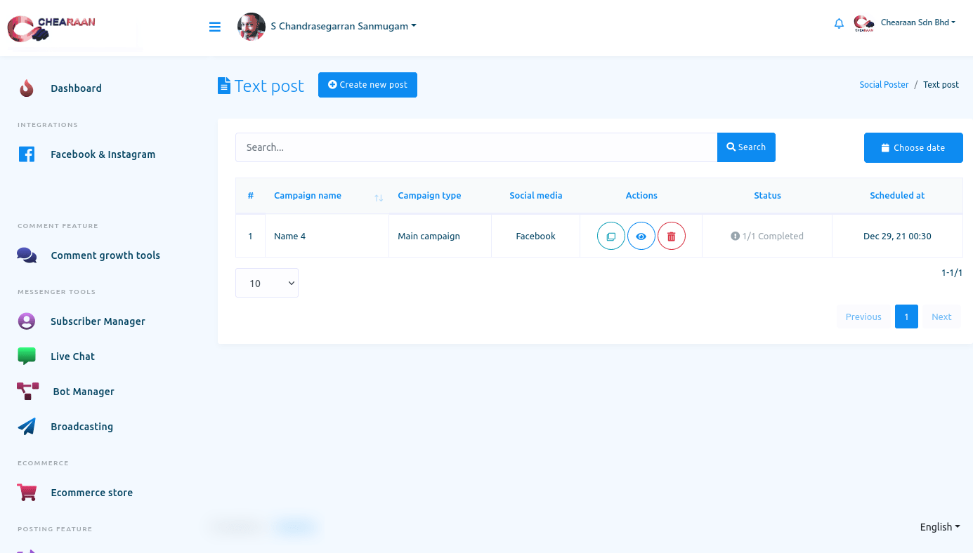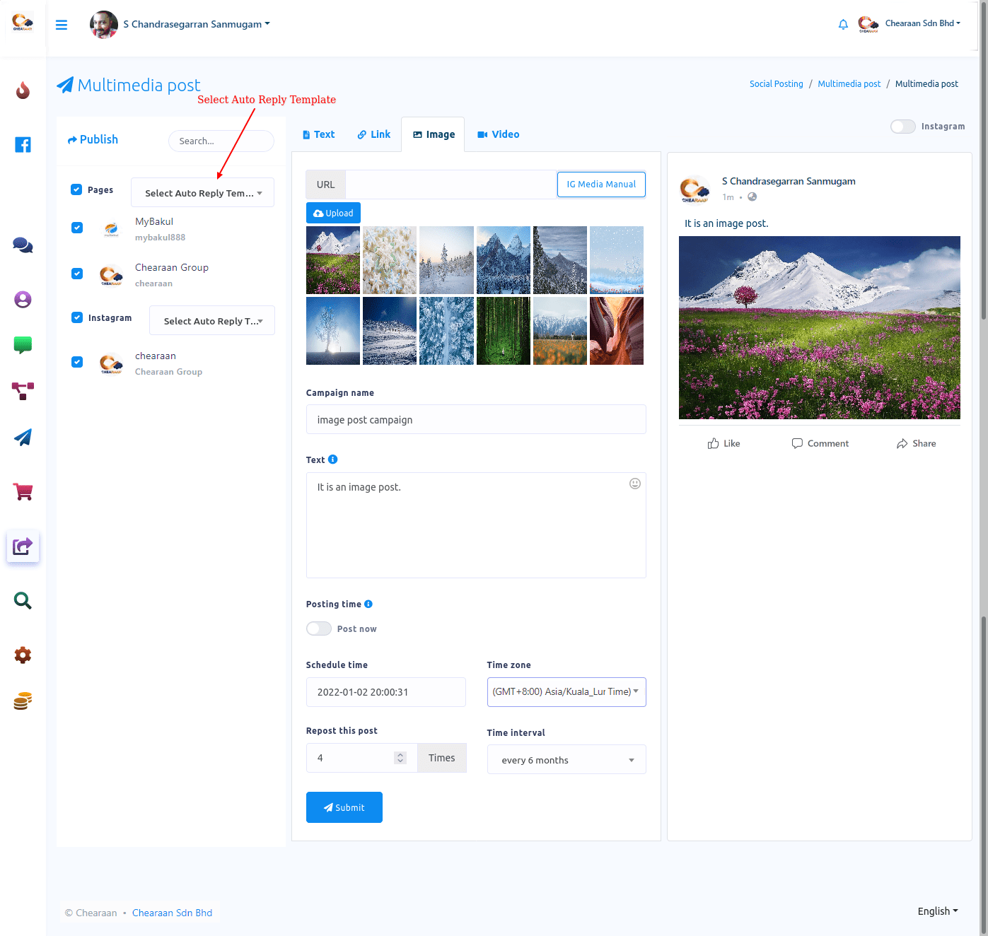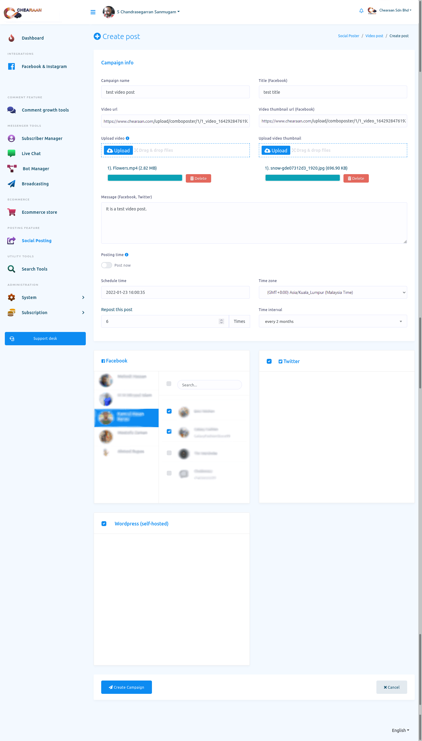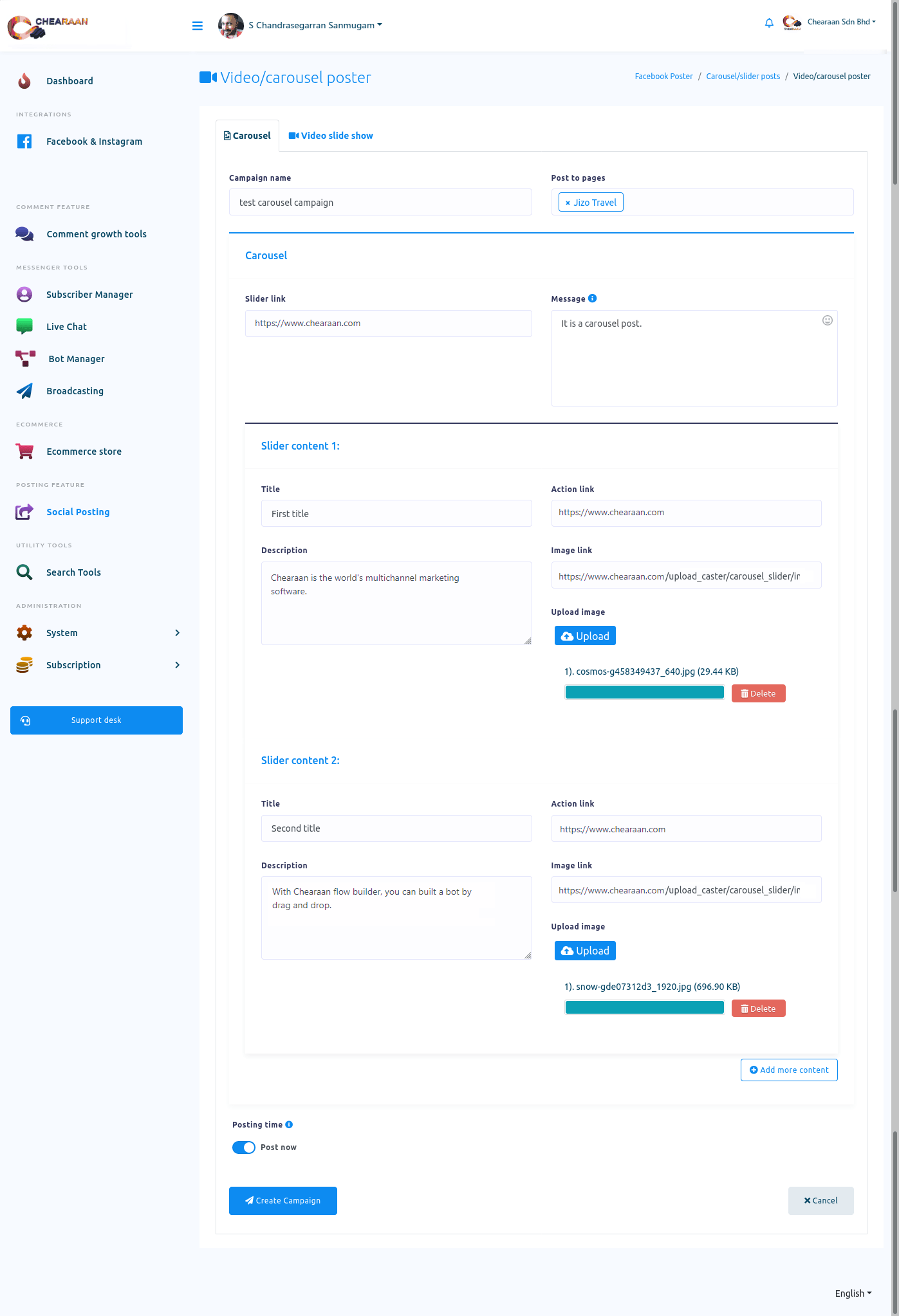 In this article, I will show you how to publish and schedule posts on Facebook, Instagram and other social media with Social posting feature of Chearaan.