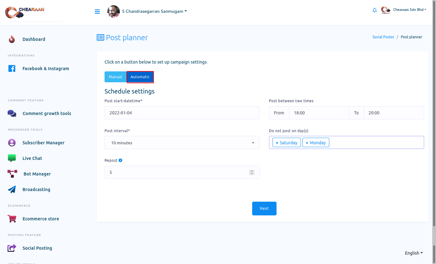 In the automatic settings, all the posts will be scheduled to be published. When you select the autonomic option, some fields will appear. You have to fill out the fields to schedule all the posts in the campaigns.