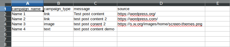 In the CSV file, you just have to provide the campaign name, campaign type, message and source for link and image post. After you have provided this information on a CSV file, you have to upload the file.